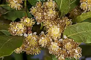 Bladene er elliptiske og læderagtige med kruset og tandet rand. Oversiden er skinnende mørkegrøn, mens undersiden er lysegrøn. Blomstringen sker i marts-april, hvor man kan se de små, 4-tallige blomster sidde i korte stande ved skudspidserne. De enkelte blomster er bleggule til grøngule. Frugterne ligner oliven i form og størrelse. De er først grønne, men bliver sorte ved modenhed.[3]