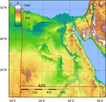Hovedparten (mere end 90 %) af Egyptens areal er et sterilt ørkenplateau. Landets livsnerve er den frugtbare Nildal, jordens største flodoase, som strækker sig fra Sudan i syd ca. 1.500 km nordpå til Middelhavet. Nildalen er et smalt, grønt bælte (ca. 5–15 km bred), som nær havet breder sig til et stort delta. Landet omkring flodens øvre løb i syd kaldes fra gammel tid Øvre Egypten og deltalandet Nedre Egypten. Syd for Kairo breder ørkner sig på begge sider af Nilen. Den libyske ørken i vest gennemskæres af dybe lavninger (blandt andre Qattaralavningen, 134 m under havet) med oaser og afløbsløse saltsøer. Den arabiske ørken øst for Nilen er en klippeørken med udtørrede floddale (wadier) og høje randbjerge langs kysten mod Det Røde Hav. Højest når massivet på Sinaihalvøen (omtrent 2.600 m.o.h.). Store dele af landet har ekstremt tørt ørkenklima med hede, tørre somre og milde vintre. Kystlandet i nord har middelhavsklima.[8]