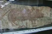 Et andet vægmaleri viser en mand, der løber (eller danser?), mens han holder en bøjet genstand — måske en bue. En prikket form skal måske forestille et lændeklæde af leopardskind.[26]