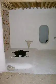 Korn og linser blev opbevaret i flettede kurve og murede kornbinger i et spisekammer. Kornbingerne ser ud til at have været hjemsøgt af mus, og der er da heller ikke fundet spor efter katte. I det største værelse fandtes noget, der minder om et alter. I nogle hjem var alteret dekoreret med hovedskaller af vilde okser muret ind i væggen. Hornene blev malet okerrøde i kontrast mod den hvidkalkede væg. Den røde farve blev også benyttet til vægmalerier af gribbe, urokser og leoparder; og til at afsætte håndaftryk på væggen. [19] Hovedskaller af døde slægtninge lå fremme i dette rum, mens skeletterne blev begravet under gulvet. Ovenpå gravene blev der rejst små podier, der måske blev benyttet som senge. Vægge, gulv og forhøjninger blev jævnligt smurt med ler og hvidkalket. Den hvide farve gjorde, at værelserne har virket ret lyse, selv om solen kun skinnede ind gennem den lille tagluge. Der måtte hvidkalkes hyppigt pga. al røgen og soden fra ovnene. En gang omkring hvert 100. år rejste familien et nyt hus på resterne af det gamle. Det nye var næsten altid identisk, med vægge og skillevægge placeret på nøjagtigt samme sted som i det underliggende hus. Sådan holdt de det gående i omkring 1.000 år, mere end 30 generationer. [20]