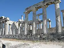 Éginas lokale gudinde i antikken, Afaia, blev dyrket helt tilbage i mykensk tid. En myte identificerede hende med den kretensiske gudinde Britomartis, der flygtede fra Kreta ved at kaste sig i havet fra en klippe, efter at kong Minos havde antastet hende, [2] og reddede sig i land på Égina. Marmor-udsmykningen (nu på et museum i München) fra Afaias doriske tempel på Égina viser, at hun under påvirkning fra det nærliggende Athen var smeltet delvis sammen med Athene. Tyskere reddede udsmykningen i 1811, da de lokale bønder var i færd med at rive templet ned for at sælge marmoren til cement-produktion – til den gældende pris for kalk. [3]