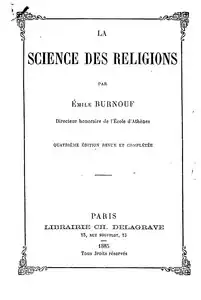 ![]() Forsiden til Burnoufs La Science des religions. Bogen kan læses ved at klikke på billedet | |