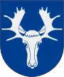 Kommunevåbnets blasonering: I blåt felt et fremadvendt elghoved af sølv.