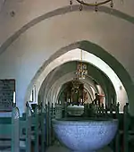 Døbefonten har en halvkugleformet kumme dekoreret med indridsede arkadebuer og arkantusblade. Den er udført i gotlandsk kalksten omkring 1300. Den hviler på et cylindrisk skaft med en kegleformet fod. Fonten står i tårnrummet, og har sikkert altid stået dér. Dette bestyrkes af, at foden i mange år var skjult under gulvbelægningen, idet man ikke har løftet fonten, når man har fornyet belægningen, men bare lagt den uden om skaftet. Først i 1984 genopdagede man foden, og hævede fonten så den blev frilagt.