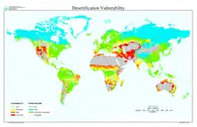 Ørkenspredning er ligeledes defineret af De Forenede Nationer i FN's konvention om bekæmpelse af ørkenspredning (UNCCD) som "nedbrydning af jord i aride, semi-aride og tørre regioner som et resultt af flere faktorer, herunder klimavariationer og menneskelig aktivitet."[5]