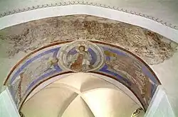Over korbuen har man i 1997 fundet rester af en udsmykning. En figur i mandorla sidder frontalt omgivet af personer, formodentlig apostle. Kalkmalerierne er ret medtagne og skal udforskes i 1998, men man er foreløbig nået frem til, at det ikke er en dommedagsmajestas eller en Traditio Legis (Nøgleoverrækkelsen), muligvis er det pinseunderet. I nichen til det tilmurede østvindue er afdækket spor af romanske kalkmalerier. I toppen kan man ane en figur muligvis med korsglorie. Over hvælvene kan man se fragmenter af den romanske udsmykning.