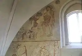 I sydkapellet ses kalkmalerier på øst og sydvæggen. De blev afdækket og restaureret i 1885-86 af Jacob Kornerup, siden er de blevet genrestaureret af Egmont Lind i 1938. Figurerne er meget lange, nærmest manierede. På østvæggen ses en stifter, der knæler foran Johannes Døberen, som kirken formodentlig var viet til.
