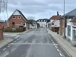 Østergade nær gågaden og centrum. Den hvide bygning i midten af billedet er Købmandsgaarden Carlshåb, der ligger i gågaden.