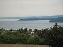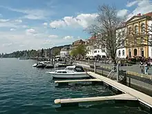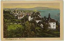 Überlingen ligger ved den del af Bodensee der kaldes Überlinger See .Baglandet er præget af bakkede morænelandskaber fra den sidste istid.