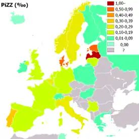 Geografisk distribution af PiZZ-genotypen (homozygøs alvorlig A1AD) i Europa.