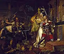 Knud den Helliges dræbes i Skt. Albani kirke, 10. juli 1086. Malet af Christian Albrecht von Benzon (1843).