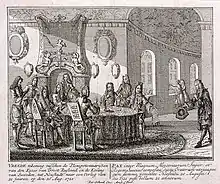 Underskrivelsen af fredstraktaten ved Freden i Nystad, der endte Den Store Nordiske Krig.