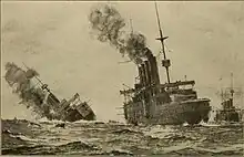 en tegning af de tre engelske krydsere der synker d. 22. september 1914