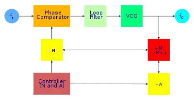 Deler A skal være strengt mindre end A end deler N. Begge delere bliver clocket af 2-modulusdelerens output, men kun deler N's output sendes tilbage til fasekomparatoren.