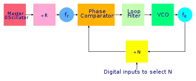 En frekvenssyntese producerer en variabel output frekvens, fo, dannet via det faselåste kredsløbs referencefrekvens, fr og hvor det variable heltal (deletal) N er deletallet for en tæller: