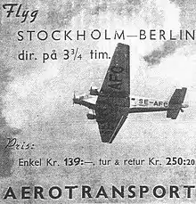 Annonce fra slutningen af 1930'erne for AB Aerotransports ruteflyvning mellem Stockholm og Berlin
