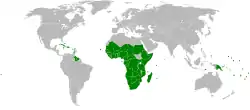 - Sydafrika (delvis), Antigua og Barbuda, Bahamas, Barbados, Belize, Botswana, Cameroun, DR Congo, Cookøerne, Cuba, Dominica, Den Dominikanske Republik, Elfenbenskysten, Fiji, Gabon, Ghana, Grenada, Guyana, Jamaica, Kenya, Marshalløerne, Mauritius, Mikronesien, Namibia, Nauru, Nigeria, Niue, Palau, Papua Ny Guinea, Saint Christopher og Nevis, Saint Lucia, Saint Vincent og Grenadinerne, Senegal, Seychellerne, Surinam, Swaziland, Tonga, Trinidad, Tobago og Zimbabwe.