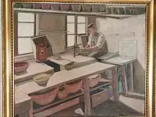 Foto af maleren med et maleri er et avisudklip fra ca. 1930. Fotograf er ukendt.