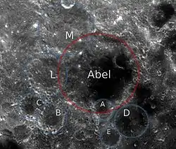 Abel med satellitkraterne A-E + L-M afmærket på billede fra rumsonden Clementine. | ||