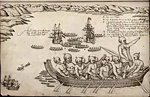"Om aftenen en time efter solnedgang så vi mange lys på land og fire fartøjer nær kysten, hvoraf de to sejlede mod os. Vores to både kom tilbage til skibene og meldte, at der havde været ikke mindre end 13 favne vand og da solen gik ned (den gik ned bag højlandet), var de stadig omkring en halv mil fra kysten. Efter at vores folk havde været ombord i omkring et halvt glas, begyndte folk i de to kanoer at råbe fjendtligt til os. Vi forstod ikke det mindste, men da de havde råbt af os flere gange, råbte vi alligevel tilbage, som en slags svar. De kom ikke nærmere end et stenkast. De blæste også mange gange i et instrument, som lød som maurernes trompeter. vi fik en af vores mænd (som kunne spille lidt trompet) til at spille lidt som svar."[9]