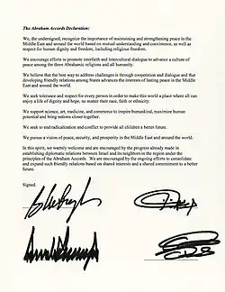 - "Full text of the Abraham Accords signed by Israel, the UAE and Bahrain". The White House. 16. september 2020. Arkiveret fra originalen 2020-10-13. Hentet 2020-09-25.