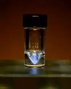Actinium-225 medicinsk radioisotop. Bemærk den blå glød, der stammer fra ioniseringen af den omkringliggende luft af alfapartikler.
