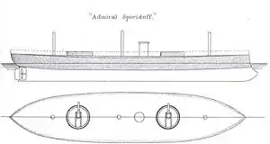 Opkaldt efter Grigory Spiridov (1713-1790), der var en russisk admiral og gjorde sig fordelagtigt bemærket i flere søslag. Kilderne er noget uenige om skibets byggeperiode: Køllægningen ses angivet som både 1866 og 1867, mens færdiggørelsen både kan findes som 1869 og 1870. Skibet var oprindeligt færdigt i 1869, men i følge de russiske kilder gik man straks i gang med at bygge om på det, så det i realiteten først var i tjeneste fra 1871. I 1892 blev Admiral Spiridov i flådelisten omklassificeret til kystpanserskib, og senere til skoleskib.[4]
