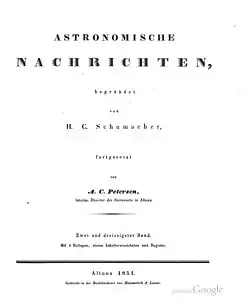![]() Titelblad til Astronomische Nachrichten (1851) af A.C. Petersen | |