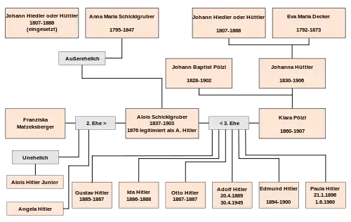 Begge Hitlers forældre stammede fra Waldviertel. Mølleren Johann Georg Hiedler giftede sig i maj 1842 med Maria Anna Schicklgruber, der i 1837 havde født en dreng, Hitlers far Alois, udenfor ægteskab. Da Maria døde allerede i 1847, voksede Alois op hos Hiedlers bror, Johann Nepomuk Hüttler i Spital. (De to brødre hed altså begge Johann til fornavn, men stavede til gengæld efternavnet på hver sin måde.) Alois hed Schicklgruber til efternavn, til han var henved fyrre. I 6. juni 1876 erklærede Johann Hiedler for en retsskriver og i tre vidners nærvær, at Alois var hans søn, og Alois Schicklgrubers navn blev ændret til Alois Hitler i dåbsprotokollen.[2]