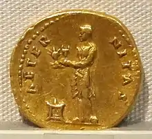 Aeternitas i form af en fugl (Fugl Føniks) på hænderne af Vespasian illustreret på en guldmønt