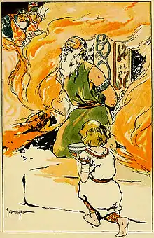 Tegning fra 1908 af Agnar, der hjælper Odin (forklædt som Grímnir) under Geirrøds tortur.