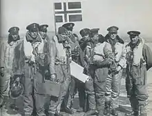 Agnar Næss, helt til venstre på billedet, med resten af Catalina-mandskabet på Vingtor efter et togt d. 2. maj 1942. Med et par undtagelser var dette det samme mandskab som modtog Krigskorset for et togt mod Norge senere samme måned.
