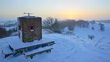 Postament på Agri Baunehøj, ommuret postament, nu som udsigtsplatform med pil der viser punkter i landskabet