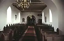 Apsis har bevaret sit halvkuppelhvælv, mens kor og skib har flade bjælkelofter. Den runde korbue er bevaret med skråkantede sokkelsten og kragbånd. Altertavlen er et snitværk i højrenæssance fra 1601, og i storfeltet er indsat et maleri fra 1857 af T. M. Jensen. Prædikestolen fra 1659 er skænket af Tim Klausen Salpetersyder, som havde anlagt et salpeterværk i området.