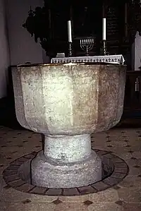 Døbefonten er en gotlandsk kalkstensfont med femtensidet kumme og rund fod.