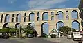 Mens akvædukten er af romersk oprindelse, blev den nuværende struktur genopbygget af osmannerne i det 16. århundrede.[1] En byzantinsk barrieremur fra begyndelsen af 1300 -tallet, bygget som en del af befæstningerne på Akropolis i Kavala, fungerede sandsynligvis også som en akvædukt. I så fald ville det have været et sjældent eksempel på en byzantinsk akvædukt, da byzantinske byer mere typisk brugte brønde og cisterner frem for enten at vedligeholde eksisterende romerske akvædukter eller bygge nye.[2] Spærrevæggen blev erstattet med den nuværende buede akvædukt under Süleyman 1. under reparation og forbedring af de byzantinske befæstninger. Nogle forfattere daterer denne konstruktion til tidspunktet for belejringen af Rhodos i 1522, men en mere sandsynlig dato er mellem 1530 og 1536.[3] Så sent som i 1911 forsynede akvædukten byen med drikkevand fra Pangaiobjergene.