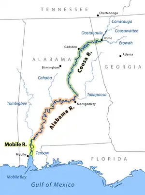 | Udspring | Sammenløbet af Tallapoosa Coosa rivers i nærheden af byen Montgomery |