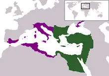 Da Romerriget blev delt i en østlig og en vestlig del i 395, blev Illyrien øst for floden Drinus (Drina mellem Bosnien og Serbien), medregnet landområder som nu omfatter Albanien, styret af det Østromerske rige, men var kirkeligt afhængig af Rom. I år 732 underkastede den byzantinske kejser Keo 3. fra Isauria området under patriarken af Konstantinopel. I århundrederne der efter var de albanske landområder valplads for kirkestridigheder mellem Rom og Konstantinopel. Tilbageværende under romersk indflydelse forblev albanere, som levede i bjergene i nord, ved deres romersk-katolske tro, mens de i sydlige og mellemste områder blev græsk-ortodokse i deres tro og dannede nære forbindelser med grækere i syd.[3]