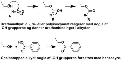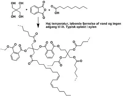 ![]() Reaktion mellem polyvalent alkohol, phtalsyreanhydrid og fedtsyre giver en alkyd |
