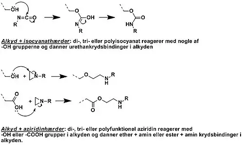 Som hærder anvendes enten en isocyanathærder eller en aziridinhærder. Bemærk at reaktionen med isocyanathærder er identisk med den reaktion som anvendes til at fremstille urethanmodificerede alkyder.