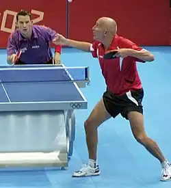 ![]() Allan Bentsen (til højre) spiller mod Dániel Zwickl i første runde af bordtennisturneringen ved Sommer-OL 2012 i London. | |