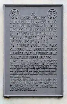 Mindeplade opsat på bygningen, hvor Alliance Internationale de Tourisme blev grundlagt i 1898