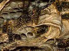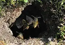 Ofte anlægges boet underjordisk i muse- eller muldvarpehuller, der udvides efterhånden som boet bliver større. I folkemunde kaldes disse hvepse for "jordhvepse", men også lofter og andre mørke hulrum ved eller i bygninger benyttes. Det første bo består af syv celler til ynglen (en i midten og seks rundt om), der placeres hængende i hulrummet og er omgivet af et kugleformet papirhylster med et indflyvningshul nederst.