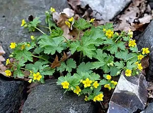 Blomstringen sker i maj måned. Blomsterne sidder flere sammen på lange stilke, der løfter dem fri af bladene. Blomsterne minder i formen om jordbærblomster, men de er smørgule. Frøene modner godt og kan også spire her i landet, bare forholdene er i orden.