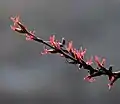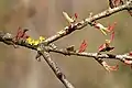 Blomsterne ses før løvspring. De hanlige planter har kun støvdragere, som sidder i små kvaste, men de hunlige har klart røde blomsterblade i små bundter. Frugterne ses meget sjældent i Danmark, men det er små kapsler, der er bøjede som små bananer.
