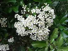 Blomstringen sker i juli, og blomsterne sidder i endestillede halvskærme (på grene, som er mere end 2 år gamle). Den enkelte blomst minder i størrelse, form og "duft" om tjørneblomster. Frugterne minder lidt om små rønnebær. De danner næppe spiredygtige frø her i landet.