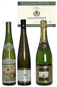 - Etiketten viser som hovedregel navnet på druesorten eller et mærke eller betegnelsen "Edelzwicker" eller "Gentil" (blanding af en række grønne druesorter.) Enkelte geografiske angivelser kan også fremgå såsom navnet på landsbyen eller vingården.