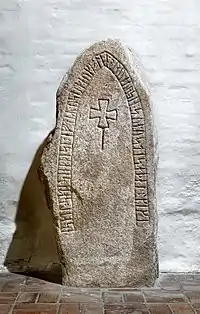 | Sekundær anvendelse | Bygningssten i kirken, indmuret i våbenhuset. |