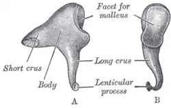 Selvom ambolten har sit navn fra sin lighed med smedens ambolt, kan den også sammenlignes med en kindtand (molar), fordi den har to "rødder" af forskellig længde og med stor indbyrdes afstand. Foruden disse "rødder" består den af en kropsdel (corpus incudis), hvis forreste flade har en dyb konkav/konveks fordybning, der forbinder sig med hammeren. De to "rødder" danner næsten en ret vinkel med hinanden. Den korte "rod" (crus breve), som har en næsten konisk profil, peger vandret bagud og er forbundet med fossa incudis, mens den lange "rod" (crus longum) forløber næsten lodret bagved og parallelt med hammerens skaft (manubrium). Den ender i en afrundet form, der danner et led til forbindelsen med stigbøjlen.