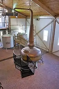 - Nu er man nået til destillationsprocessen der næsten altid forgår af to omgange (ligesom skotsk whisky) - og ikke tre gange som i Irland. I første destillation opvarmes øllet enten i en "Pot Still" (typiske lavet af kobber) eller i en "Column Still" (typisk lavet af rustfrit stål). Forskellen på de to metoder er forklaret nedenfor. Når øllet varmes op fordamper alkoholen før vandet - idet alkohol har et kogepunkt på 78,29 grader celsius. Reelt skal øllet dog varmes op til 90 grader inden der sker noget, grundet det høje vandindhold. Alkoholdampene afkøles i destillationsapparatet og omdannes derfor til et klar væske med en højere alkoholprocent end øllet. Alkoholprocenten er efter første destillation typisk 20-30% og producenterne kalder denne væske for "Low Wine".